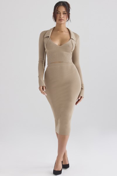 Designed with a daring plunge front that's held together with self rouleau ties, 'Marianne' is chic and stylish. It's cut from our luxurious stretch knit and has a ribbed waist and cuffs to enhance the close fit. We love this paired with the matching 'Heather' skirt for cosy days in or brunching with the girls. We recommend folding our knitwear as it will stretch on a hanger.