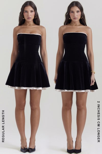 Our 'Marilla' mini dress is just waiting for a night out. Made from plush stretch velvet, it has a strapless, corseted bodice that laces up at the back to cinch your waist to perfection and is beautifully trimmed with soft satin along the neckline and peaks below the hem. The gathered skirt is ultra flattering and it zips to the side for easy on. Wear yours with barely there sandals like 'Tao' in black.