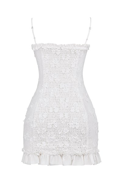 The romantic mood of our Capri collection make dresses like 'Marlene' your go-to garden party dress. It's cut from a beautiful cotton-rich broderie anglais with pretty 3d flowers. Marlene has pretty ruffled trims and a flattering shirred back to secure the fit. It zips to the side for easy on. Wear yours with heels like 'Lola' in white. Taller girls, we heard you and this is available in two lengths, our regular mini length and 2 inches / 5cm longer. Regular: Approx 85cm and Longer: 90cm. WHERE TO WEAR: