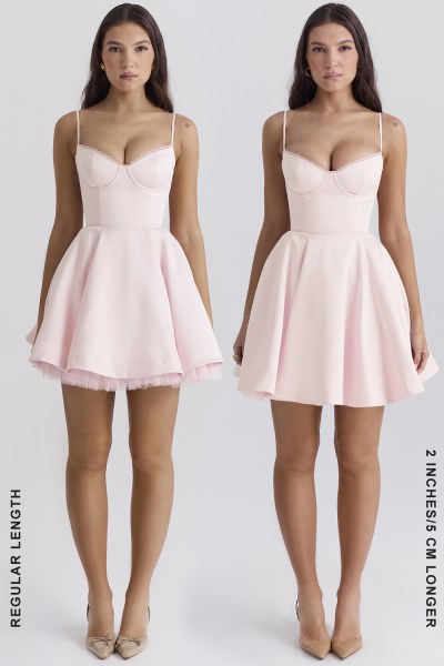 This fairytale creation is the mini version of our 'Mademoiselle' dress. The bodice is boned to perfectly cinch your waist and has a pretty sweetheart neckline with underwired cups. The delicate straps adjust for the perfect fit and 'Minimoiselle' is all about the floaty mini skirt, fitted with voluminous layers of the softest tulle to keep the shape beautifully.We love how it has pockets and is fully lined for comfort with a zip to the back for easy on. Wear yours with our 'Lola' high heels in white for a dainty look. The 'Regular' cup option suits cup size A-C whilst the 'Bigger' cup option suits cup size D-E. Taller girls, we heard you and this is available in two lengths, our regular mini length and 2 inches / 5cm longer. Regular length: Approx 79cm and Longer length: Approx 84cm. Lengths include straps. WHERE TO WEAR: