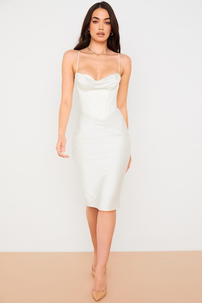 Delicate and dainty, HouseofCB updates the timeless slip dress with a beautifully draped cowl neckline. 'Myrna' is made from our lustrous silk satin in ani ivory tone and is cut on the bias for a beautiful drape and figure skimming silhouette. The bodice features our incredible corsetry boning to really cinch the figure in and is fully lined in a textured fabric for a non slip hold. We love the pretty half cups that are softly lined and underwired for full support and ultimate uplift and the delicate spaghetti straps are adjustable for the perfect fit. The skirt is fully lined in stretch satin for a smooth and comfy feel and sits elegantly just below the knee. It has a zip to the back for easy on. Wear yours with a pointy heel like 'Paris' for a super feminine vibe. The 'Regular Cup' option suits cup size A-C whilst the 'Bigger Cup' option suits cup size D-E. This product comes up a little small due to the corsetry boning. We suggest if you're between sizes to size up.