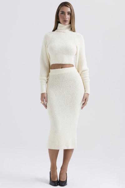 The textured knit of our 'Nyala' turtleneck is so soft and enduring. It's crafted from the softest natural cotton and modal for an ultra cosy feel. 'Nyala' has a slightly cropped shape and blended with generous stretch so it feels especially comforting. 'Nyala' will make any outfit feel chic and we love it paired with our 'Mishka' midi skirt to match the cream tone. We recommend folding our knitwear as it will stretch on a hanger.