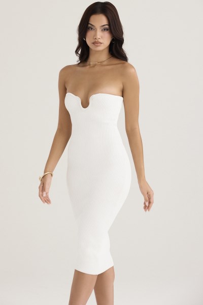 Sculpting and stretchy ribbed knit dresses are so flattering and effortlessly stylish, making our 'Oriana' midi dress a season favourite. It's cut for a body skimming fit and has a notched sweetheart neckline in a strapless silhouette that's fitted with an inbuilt wire to keep the shape. It falls below the knee in a classic midi length and pulls on for easy wear. Team yours with our 'Ghost' Clear strap sandals.