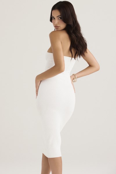 Sculpting and stretchy ribbed knit dresses are so flattering and effortlessly stylish, making our 'Oriana' midi dress a season favourite. It's cut for a body skimming fit and has a notched sweetheart neckline in a strapless silhouette that's fitted with an inbuilt wire to keep the shape. It falls below the knee in a classic midi length and pulls on for easy wear. Team yours with our 'Ghost' Clear strap sandals.