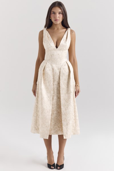 The 'Paloma' Ivory Metallic Jacquard Midi Dress is perfect for sophisticated events like weddings, formal galas, upscale cocktail parties, and holiday gatherings. With its elegant design and dramatic overskirt, it’s also a stunning choice for a night at the opera, a fancy dinner, or any occasion where you want to feel effortlessly glamorous TEAM YOURS WITH: