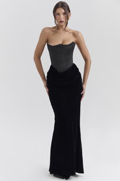 Introducing ‘Persephone', a sultry black maxi dress that’s destined to be your go-to for unforgettable evenings. With its daring peaked neckline, this corseted bodice is designed to accentuate your figure and exude confidence. The lush velvet skirt flows gracefully, draping across your hips like a gentle whisper, creating a silhouette that’s as captivating as it is enchanting. Falling to a puddle length on the floor, it trails behind you with a luxurious flair that commands attention with every step. Perfect for candlelit dinners or glamorous soirées, ‘Perse’ is all about making a statement. And you can forget the fuss; this dress zips up the back for easy wear and feels just as sumptuous as it looks. For the perfect fit, our A-C cup girls will want to go for our ‘Regular Cup’ option, and our ‘Bigger Cup’ will best suit our D-E cup girls. WHERE TO WEAR: