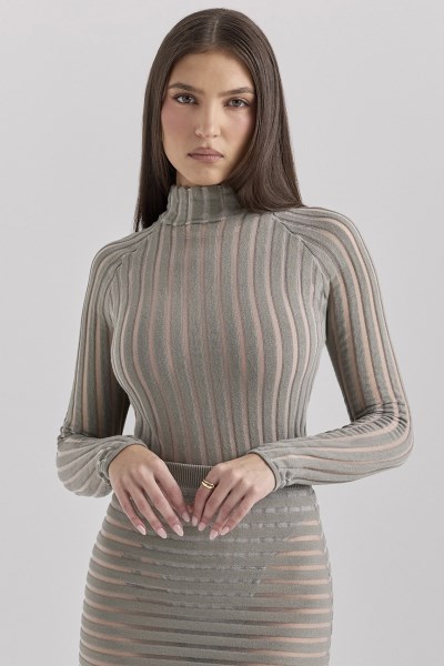 The 'Rowena' bodysuit in grey combines bold design with practical comfort. Featuring semi-sheer velour-effect stripes, this daring piece is cut with a turtleneck and long sleeves for a sleek silhouette. The pull-on style is equipped with gusset fastenings for convenience, while the front is lightly lined to ensure minimal show-through. Perfectly pairing with the 'Margo' skirt, the 'Rowena' bodysuit makes a striking addition to your wardrobe, ready to command attention wherever you go. WHERE TO WEAR: