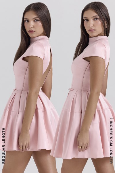 In just three words: petal pink perfection. But if you pushed us to say more, we’d tell you that Saida is a dreamy mini that manages to strike elegance without feeling too ‘grown-up’. The carefully stitched bodice is only enhanced by its silky sheen, while the bow-accented waist opens into a pleated mini skirt for that hourglass finish. The backless design, contrasted against the high neckline and short sleeves, subverts expectations in a sexy, yet sophisticated way. For the perfect fit, our A-C cup girls will want to go for our ‘Regular Cup’ option, and our ‘Bigger Cup’ will best suit our D-E cup girls. Some say length doesn’t matter, but we beg to differ. That’s why this dress comes in two options – our ‘Regular’ and ‘Longer’ lengths (see below for length specifics.)