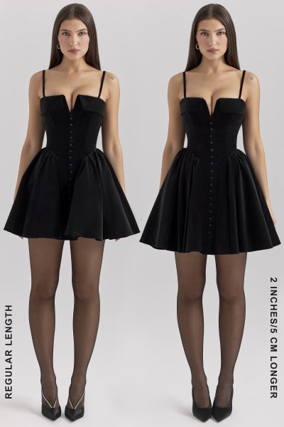 'Selina' doesn’t just enter the room—it owns it. This black velvet mini is all about bold charm, with its tulle-layered skirt bringing a playful bounce and dainty buttons adding a touch of intrigue. The luxurious velvet hugs in all the right places, and the corset is boned for that waist cinch but the easy back zip lets you slip into confidence without a second thought. Flirty, elegant, and undeniably magnetic, 'Selina' is the dress for nights you won’t forget. WHERE TO WEAR: