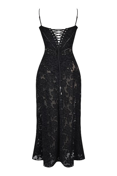 'Seren' is perhaps our most romantic dress yet and we're loving the corset inspired lace up back for a vintage feel. It's cut from a luxurious textured Jacquard in black, embellished with floral blooms. 'Seren' features a flattering shaped bust with delicate rouleau shoulder straps and comes complete with matching undies.