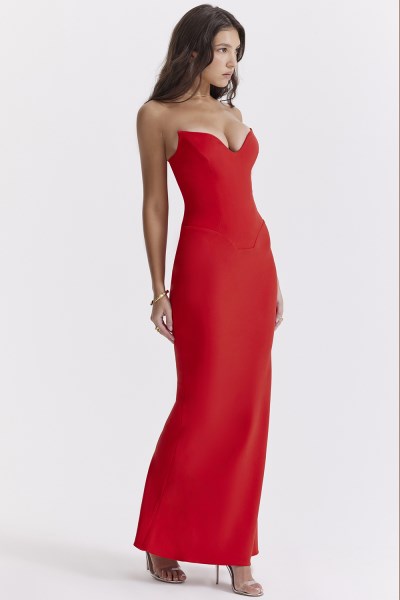 Glamorous, elegant and timeless are the three words that perfectly describe 'Tamara'. This stunning creation is cut from cherry stretch crepe with a strapless peaked neckline that showcases the bust and highlights your décolletage so beautifully.